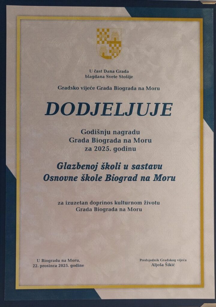 Osnovna glazbena škola pri Osnovnoj školi Biograd dobitnik je Godišnje nagrade Grada Biograda na Moru za 2025. godinu za izniman doprinos kulturnom životu Grada Biograda na Moru. Tim nastavnika glazbene škole čine: Lucija Butina- flauta, Francesca Paleka- klavir i solfeggio, Antonija Šoša Ledenko i Natalija Bugarija- klavir, Lorena Malovan i Marino Perović- klarinet, Valentin Stante- solfeggio, Ema Stein i Darko Kordić- gitara, i Mateo Fotak- tambura. Iza plana rada glazbene škole stoji vizija voditeljice glazbene škole Eme Stein o glazbenoj školi kao mjestu ugodne i poticajne atmosfere za razvoj svakog djeteta, te školi koja pored glazbene izvrsnosti njeguje prije svega odgojnu komponentu glazbe i suvremena pedagoška stremljenja. Proteklu školsku godinu 2024./2025. zajedničkim trudom i zalaganjem nastavnici glazbene škole učinili su najuspješnijom školskom godinom Glazbene škole Biograd: ostvaren je niz javnih nastupa učenika glazbene škole- njih čak 30, od kojih mnogi kroz suradnju sa Gradom Biogradom i Turističkom zajednicom Grada Biograda, Knjižnicom Biograd na Moru, te drugim ustanovama u gradu i okolici, čime je glazbena škola postala prepoznata u javnom prostoru. Održana je prva Ljetna glazbena škola Biograd, jedina na području Zadarske županije. Poseban fokus u radu glazbene škole usmjeren je na komorno muziciranje kroz dva školska orkestra- žičani i puhački, te druge komorne sastave koji povezuju druženje i glazbu i osnažuju duh zajedništva među učenicima. Izvrsne solistice gitaristice donijele su šest zlatnih i srebrnih nagrada sa državnih i međunarodih natjecanja učenika glazbe; zatim, ostvarena je suradnja sa drugim glazbenim školama- posebice sa glazbenom školom iz Marije Bistrice, te glazbenom školom Alberta Štrige iz Križevaca kroz međusobna gostovanja učenika. Izdan je prvi Časopis glazbene škole. Suradnja sa zadarskim glazbenim školama Blagoja Berse i Sv. Benedikta kroz koncertna gostovanja, te sa Glazbenim učilištem Elly Bašić iz Zagreba kroz edukacije za nastavnike dodatno je obogatila glazbeni život škole, a u konačnici, kao rezultat takvog poticajnog okruženja, troje učenika nastavilo je svoje glazbeno obrazovanje u srednjoj glazbenoj školi, na što smo posebno ponosni! Plodove entuzijazma ovog kreativnog tima nastavnika vidimo i u sljedećoj brojci: glazbena škola bilježi ove školske godine rekordan broj upisanih učenika! Realizacija svih projekata, koncerata i gostovanja, te modernizacija instrumentarija bila je moguća upravo zahvaljujući kontinuiranoj podršci Grada Biograda na Moru, te zajedničkoj ideji koju dijelimo sa gradonačelnikom Ivanom Knezom o glazbenoj školi kao žarištu kulturnog života grada i kolijevci kulture za mlade. Važno je napomenuti da glazbenu školu ne pohađaju samo djeca iz Biograda na Moru, već i brojni učenici iz susjednih općina Pakoštane, Sv. Filip i Jakov, Neviđane, Tkon, Polača, Benkovac- čime se značaj glazbene škole prostorno prostire na velik dio Zadarske županije. Ovo priznanje Grada Biograda na Moru djelatnici glazbene škole, zajedno sa ravnateljem OŠ Biograd Joškom Brtanom primaju sa ponosom, te nastavljaju i dalje stremiti istim idealima, širiti radost muziciranja i predano odgajati nove generacije mladih glazbenika.