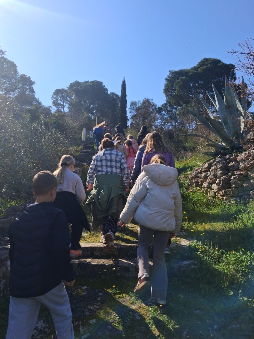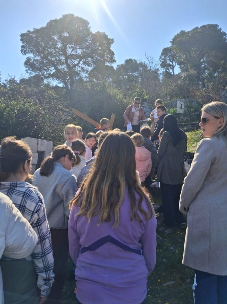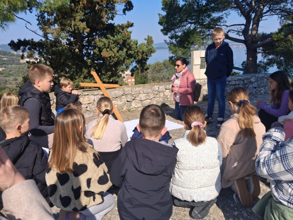 Učenici PŠ Tkon su zajedno sa svojim učiteljicama i vjeroučiteljicom išli na kratku terensku nastavu (u sklopu vjeronaučne nastave) na brdu Kalvarija u samoj blizini škole. U usponu brda je postavljeno 14 postaja križnog puta, a na samom vrhu se nalazi kapelica Gospe od sedam žalosti. Moleći križni put od postaje do postaje razmišljali smo kako svatko od nas poput Isusa ima svoj križ. Ne samo odrasli već svaka osoba pa i najmanje dijete. Učili smo životne lekcije od svake osobe koja se spominje tijekom Isusovog križnog puta: ne biti poput Jude, Pilata, mnoštva naroda koje Isusa izruguju, guraju, pljuju već biti poput Marije, Šimuna, Veronike, jeruzalemskih žena, Nikodema. A ponajviše smo naučili od Isusa o strpljivosti, ustrajnosti, opraštanju, ljubavi i kako Bog uvijek daje da pobjeđuje dobro. Djeca su se pripremala za ovu pobožnost križnog puta izrađujući postaje križnog puta te preuzimajući svaki pojedinačno ulogu po kojoj su se uživili i srcem potpuno približili Isusu u Njegovoj muci i smrti ali i radosti Uskrsnuća. Vjerujem da će ovako proživljen i izmoljen križni put ostati trajna uspomena djeci ali i nama odraslima. A Isusu? Može li Isusu biti nešto draže od ljubavi djece?